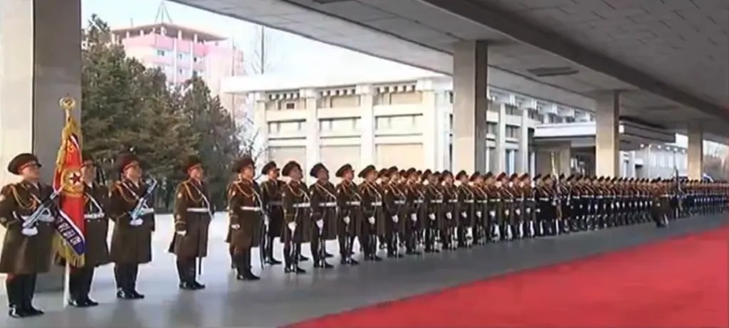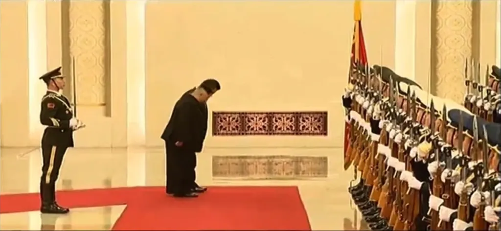 儀仗隊の閲兵式が人民大会堂の中で行われました。冒頭に国旗に一礼した習近平、金正恩の両国指導者。