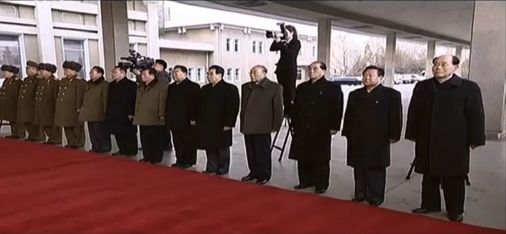 金永南首相(右端)をはじめとする幹部たちがお出迎えのために待機しています。午後とはいえ、寒い中、大変です。後ろで脚立に乗って望遠レンズを構えているカメラマンが女性です。北朝鮮公式メディアのカメラマンはたいてい男性なので珍しいです。