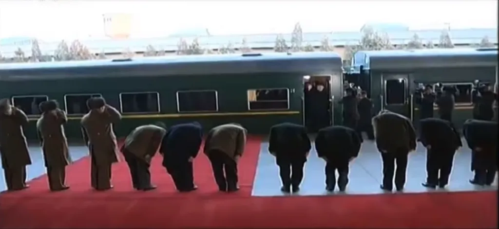 幹部たちが深々とお辞儀をする中、専用列車の開け放った扉から手を振る将軍様。照明がすごい。