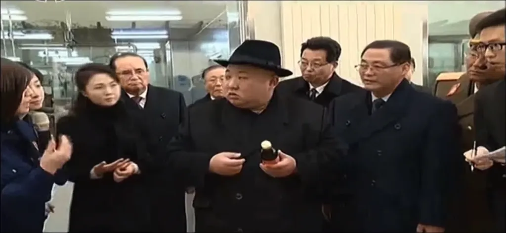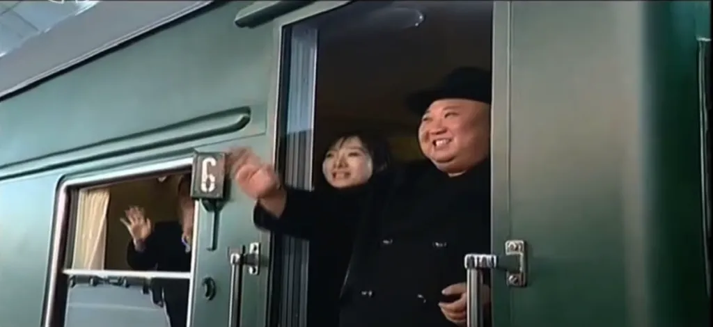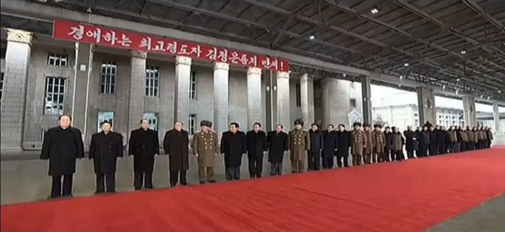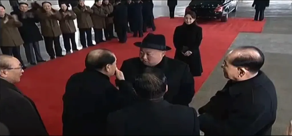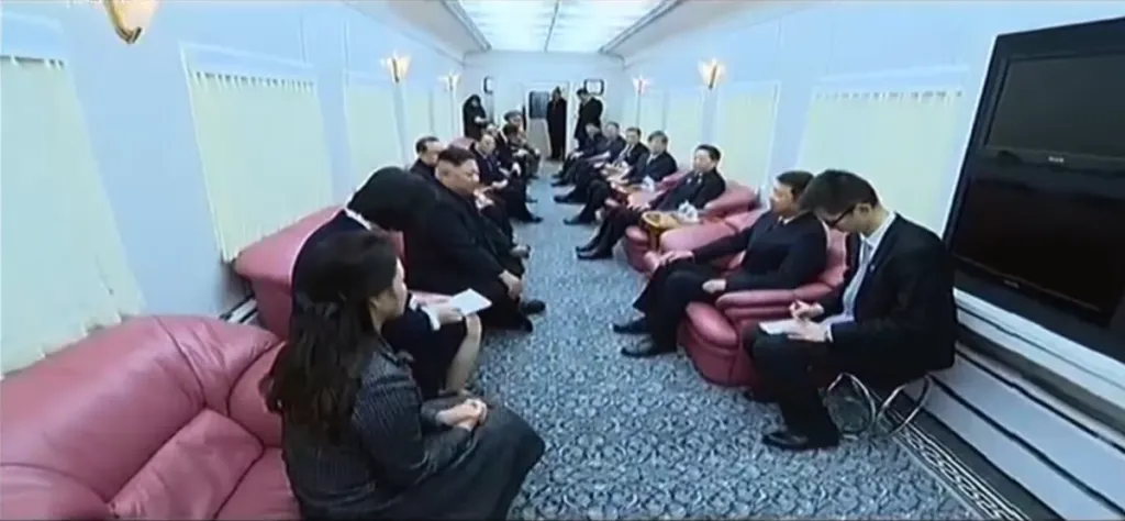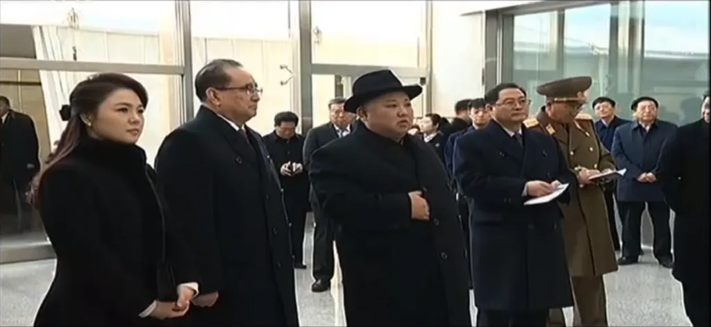 金正恩・李雪主夫妻が駅に入ってきて、見送りの幹部たちに挨拶をします。