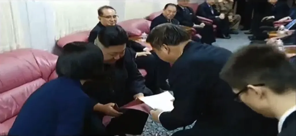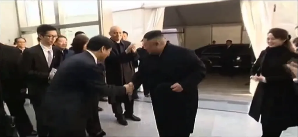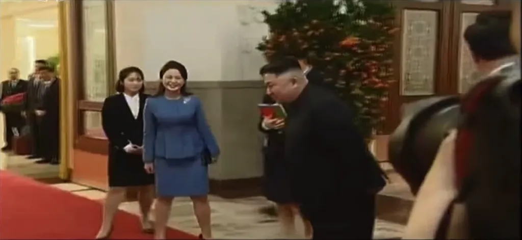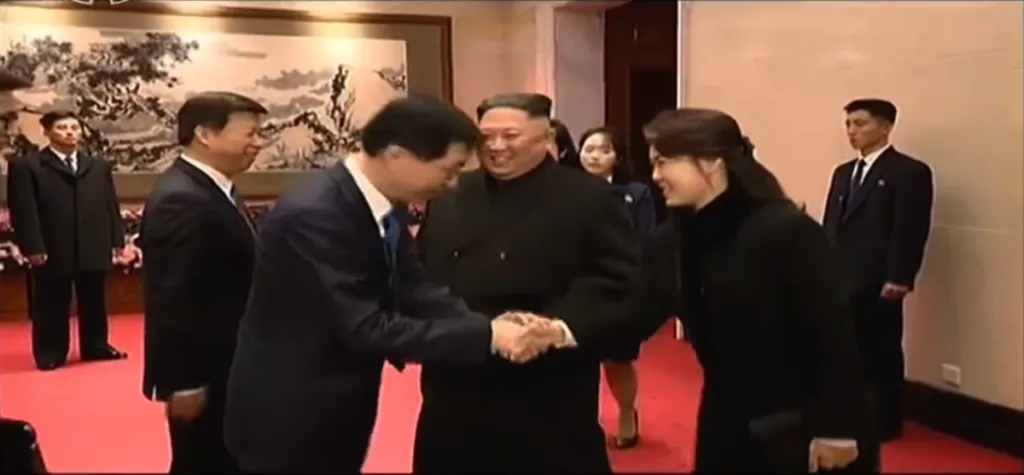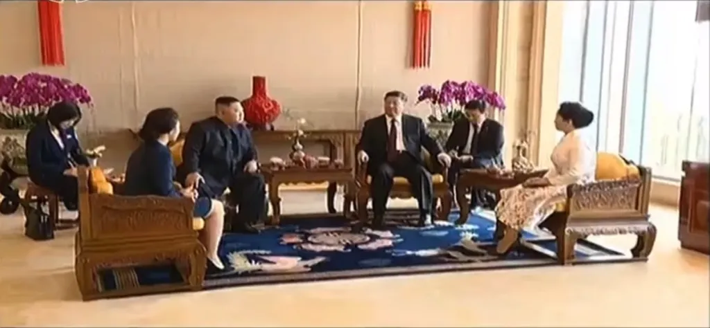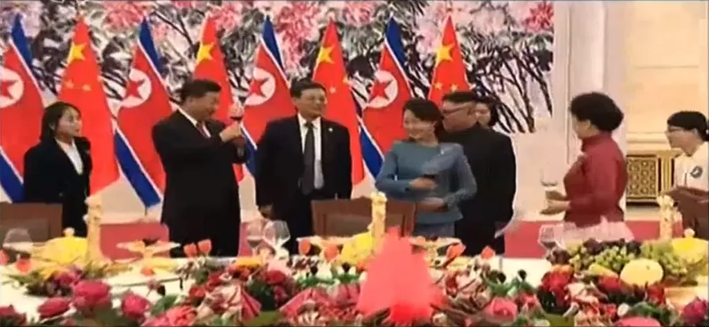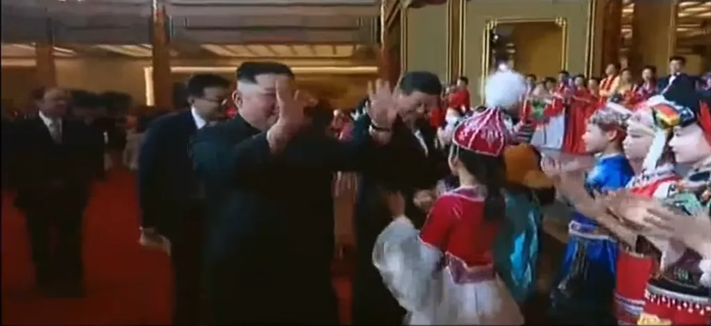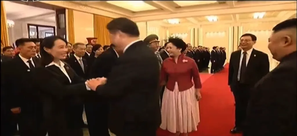 金正恩と習近平がそれぞれの政権幹部たちに挨拶をします。習近平は他の幹部とは片手で握手しましたが、金与正とだけは両手で握手をしています。重要人物であることが伺えます。