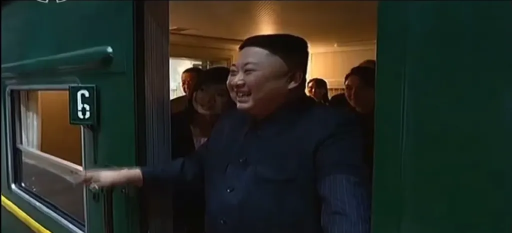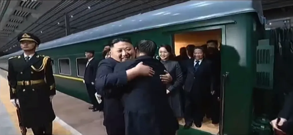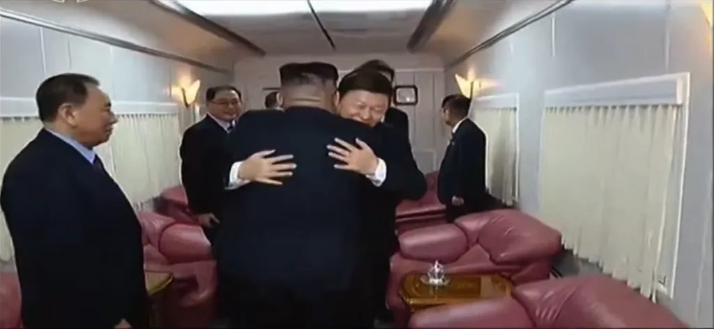お互い抱き合ってお別れです。また会うことを約束します。感動的なシーンです。金正恩の右奥には金与正の姿も見えます。6号車が専用車である可能性が一番高いですね。